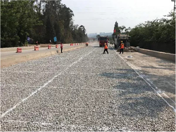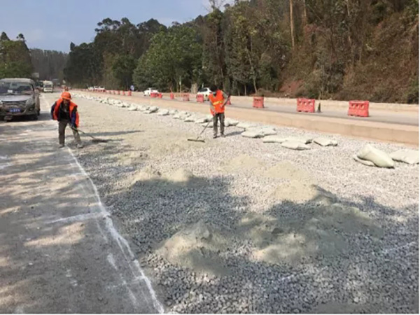 在原水泥穩(wěn)定碎石基層上面添加10%的碎石,使用平地機(jī)和人工配合進(jìn)行均勻撒布。