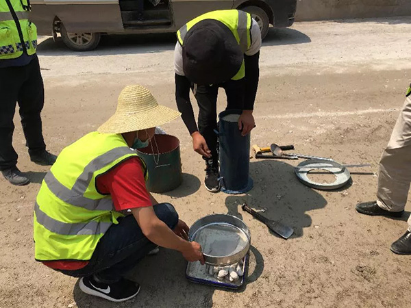 冷再生層壓實(shí)后采用灌砂法進(jìn)行壓實(shí)度檢測,并檢查冷再生層的厚度。