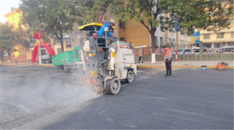 為期 2 天的攤鋪施工現(xiàn)場,一臺維特根半米檔銑刨機(jī)負(fù)責(zé)對道路進(jìn)行切頭;福格勒輪胎式攤鋪機(jī)負(fù)責(zé)岔路口等復(fù)雜工況鋪裝,保障機(jī)動(dòng)靈活的同時(shí)攤鋪更加高效;