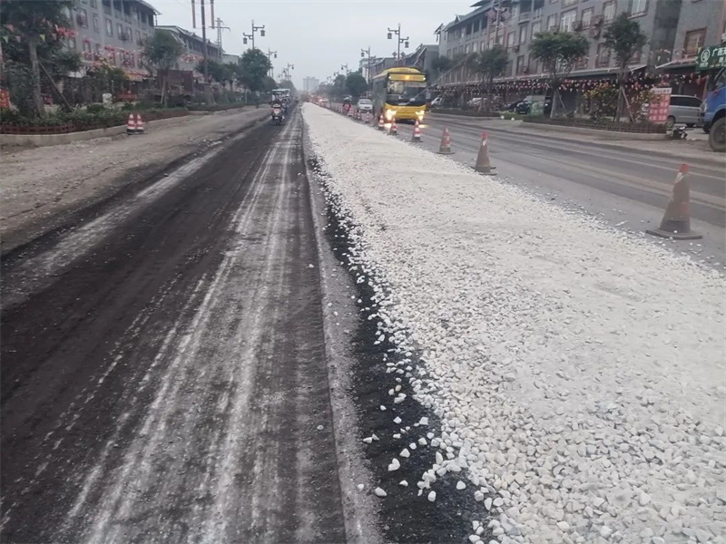 2.然后使用集料撒布機(jī)將新加的碎石和石屑(已按 1:1 比例預(yù)先混配好)均勻撒布于銑刨料之上;