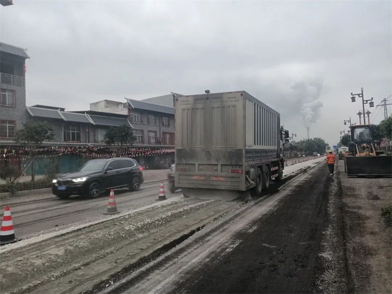 3.再使用粉料撒布車(chē)將需要添加的水泥精確和均勻撒布于新加集料之上;