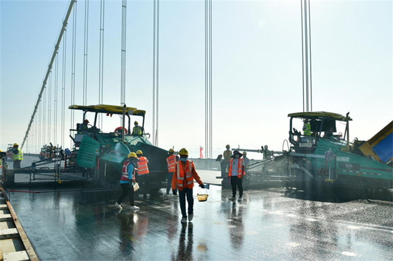 福格勒攤鋪機(jī)雙機(jī)并鋪在伶仃洋大橋鋼橋面進(jìn)行鋪裝作業(yè)場景