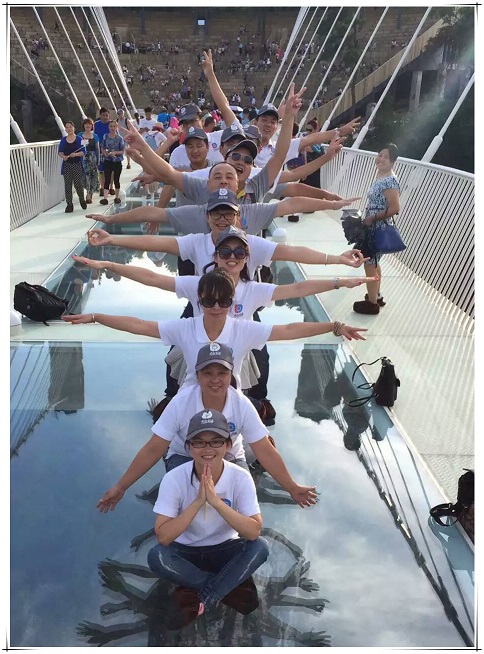 看到玻璃橋真面目后,橋上密密麻麻的人,原來膽子大的人還真多。當(dāng)腳踏上玻璃的那一刻,心里還是“咯噔”一下,起先小步慢行,也不敢往下看,因?yàn)橥高^玻璃看谷底仍心有余悸。不過,當(dāng)我們看到周圍的老老少少坐著,或躺著(其實(shí)他們是在擦玻璃呢),底氣就更足了??指叩?,告訴你:橋上人那么多,看人都來不及,哪顧得上看谷底害怕呢,是不是。